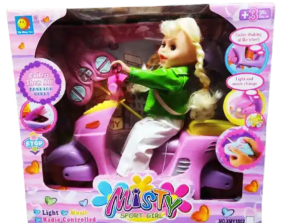 muñeca con moto a control remoto.