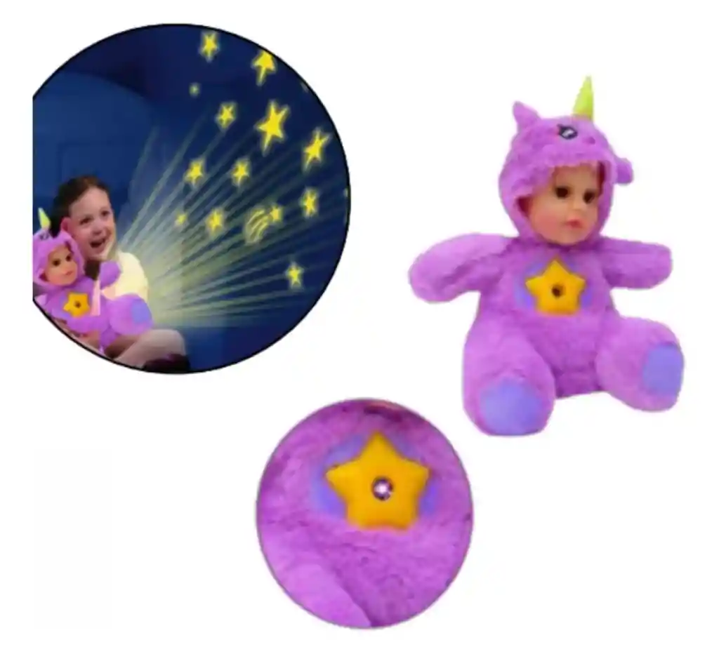 * Peluche Muñeca Bebe que proyecta luces y emite sonidos. Presione el vientre y bebe cambiará la luz en colores y sonidos diferentes. Hecha de un material suave y recomendado para niños. Proyecta estrellas brillantes y formas divertidas flotando en las paredes y el techo. Elaborada en diferentes colores. DESCRIPCION - Hermoso peluche con carita de bebe que cuando presiones el vientre, aparecerán patrones mágicos en movimiento, creando estrellas brillantes y formas divertidas flotando en las paredes y el techo.