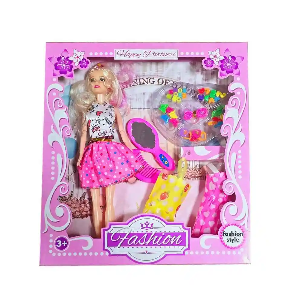 Esta muñeca luce un hermoso vestido y viene acompañada de dos vestidos adicionales para cambiar su estilo según cada ocasión. Además, incluye un set creativo para fabricar sus propias pulseras, permitiendo a los niños disfrutar de momentos divertidos mientras diseñan accesorios únicos para su muñeca. /// Nota: Los colores de los vestidos de las muñecas pueden variar ligeramente /// Ficha Técnica: Dimensiones Muñeca: 29 cm x 9 cm Dimensiones del empaque : 30 cm x 32 cm x 5 cm Material: Plástico ABS Edad recomendada: + 3 años Referencia: 663A7 Certificado de conformidad: CS-LCO-13233-2021S2/432 ** _Para defectos de fábrica o retractos: \_Por favor revise el producto apenas lo reciba y antes de usarlo. No aplican ley de retracto o defectos de fábrica luego de usar el producto. Se manejan máximo 5 días para reportar defectos de fábrica (por ejemplo, producto funciona mal, piezas faltantes, rotas, etc). Para hacer efectiva la devolución el producto debe devolverse con el empaque original, el cual debe estar en buen estado, incluir todos los documentos y las partes completas y sin daños.
