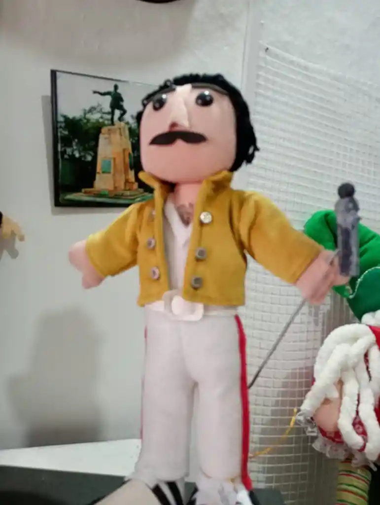 Es una pieza elaborada en trapo y algodón,imitación del icono musical britanico,vocalista de Queen mide 30cms