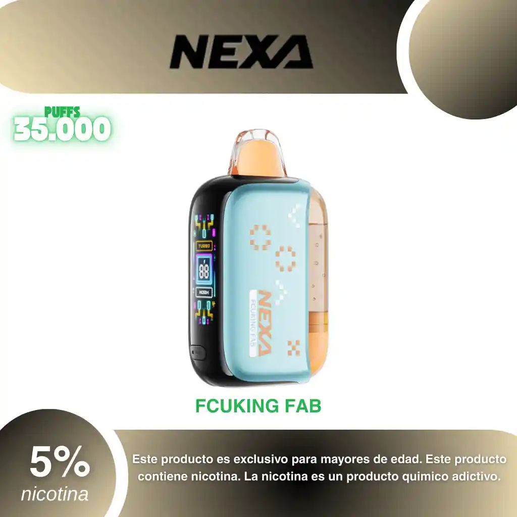 Nexa Pix 35.000 Puffs, Fcuking Fab 5% PROHIBIDA LA VENTA A MENORES DE EDAD. ADVERTENCIA: ESTE PRODUCTO CONTIENE NICOTINA, LA NICOTINA ES UNA SUSTANCIA QUIMICA ADICTIVA Y NOCIVA PARA LA SALUD. Los líquidos para vapeo contienen: propilenglicol USP, glicerina USP, sabor artificial y nicotina. Este producto puede contener nicotina, una sustancia altamente adictiva que puede generar dependencia, posibles afectaciones arteriales, cardiacas, pulmonares y otras aun no identificadas. No se recomienda su uso a mujeres en embarazo, puede generar lesiones al feto. Mantener alejado de niños y mascotas. No ingerir, puede generar irritación y/o intoxicación. Por favor antes de consumir consulte a su médico posibles afectaciones o sensibilidad a alguno de sus componentes. Los componentes de este producto pueden aumentar la sensación de ansiedad En caso de notar alguna reacción adversa por favor suspenda su uso de manera inmediata. Siga las instrucciones en el envase. No alterar sus componentes. Adquiera sus productos en sitios de confianza No use productos piratas, alterados, o en los cuales no pueda comprobar su buena procedencia, Verifique la reputación del fabricante y distribuidor antes de adquirir cualquier producto Si no es usuario fumador o vapeador no se recomienda su uso bajo ninguna circunstancia Al usar este producto usted es consciente que este producto puede generar afectaciones a su salud, incluyendo aquellas que a la fecha de la compra no se han identificado y que pueden aparecer a largo plazo