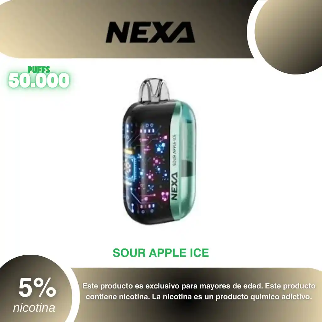 Nexa Ultra 50.000 Puffs, Sabor Manzana Verde 5% PROHIBIDA LA VENTA A MENORES DE EDAD. ADVERTENCIA: ESTE PRODUCTO CONTIENE NICOTINA, LA NICOTINA ES UNA SUSTANCIA QUIMICA ADICTIVA Y NOCIVA PARA LA SALUD. Los líquidos para vapeo contienen: propilenglicol USP, glicerina USP, sabor artificial y nicotina. Este producto puede contener nicotina, una sustancia altamente adictiva que puede generar dependencia, posibles afectaciones arteriales, cardiacas, pulmonares y otras aun no identificadas. No se recomienda su uso a mujeres en embarazo, puede generar lesiones al feto. Mantener alejado de niños y mascotas. No ingerir, puede generar irritación y/o intoxicación. Por favor antes de consumir consulte a su médico posibles afectaciones o sensibilidad a alguno de sus componentes. Los componentes de este producto pueden aumentar la sensación de ansiedad En caso de notar alguna reacción adversa por favor suspenda su uso de manera inmediata. Siga las instrucciones en el envase. No alterar sus componentes. Adquiera sus productos en sitios de confianza No use productos piratas, alterados, o en los cuales no pueda comprobar su buena procedencia, Verifique la reputación del fabricante y distribuidor antes de adquirir cualquier producto Si no es usuario fumador o vapeador no se recomienda su uso bajo ninguna circunstancia Al usar este producto usted es consciente que este producto puede generar afectaciones a su salud, incluyendo aquellas que a la fecha de la compra no se han identificado y que pueden aparecer a largo plazo