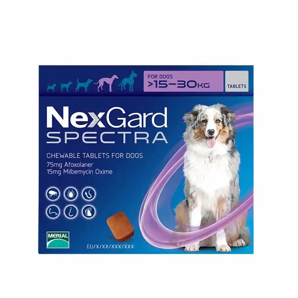 Nexgard Spectra es un tratamiento de amplio espectro para perros. Con un delicioso sabor a carne, mata las pulgas y las garrapatas previniendo la infestación durante 4 semanas. Trata los gusanos intestinales, incluidos lombrices, anquilostomas y tricocéfalos. Previene la infección del gusano del corazón cuando se administra mensualmente durante todo el año. Adecuado para usar en perros y cachorros de 8 semanas o más.