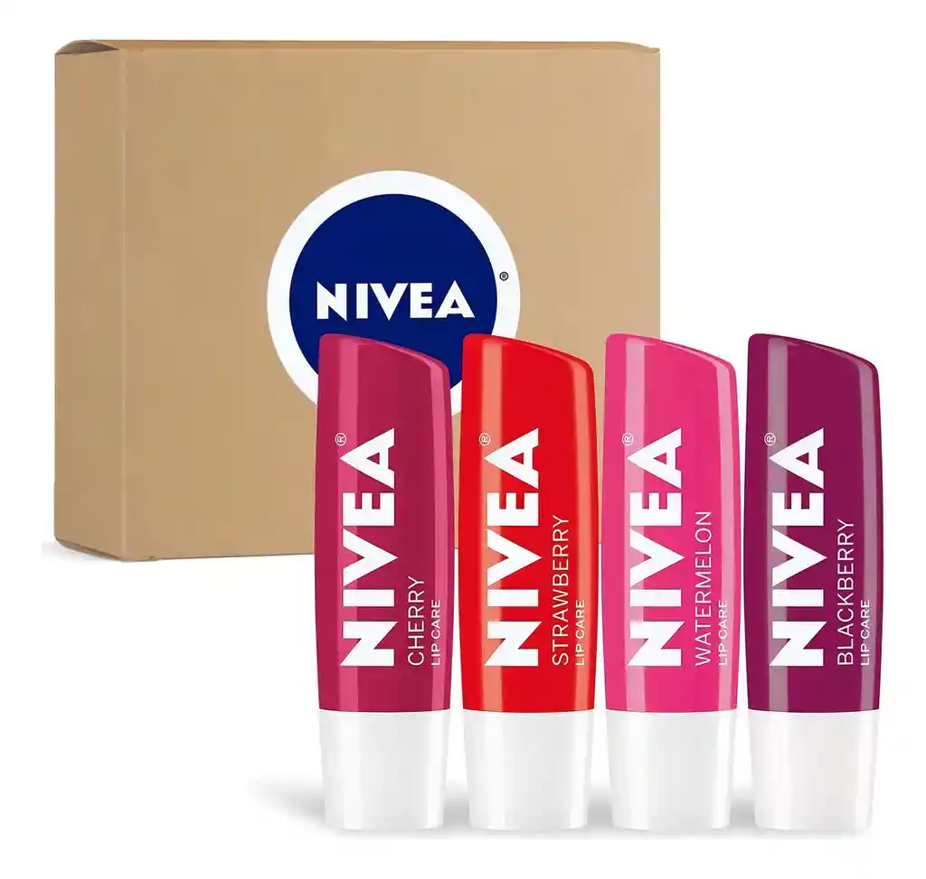 NIVEA - Cuidado de labios, Variedad de Frutas Con más de un siglo de experiencia, Nivea proporciona un cuidado excepcional para los labios. Características: * Incluye sabores de cereza, fresa, mora y sandía. * Enriquecido con manteca de karité y extracto de cereza, el bálsamo labial Cherry calma y ayuda a proteger contra la sequedad. * El bálsamo labial Strawberry, con manteca de karité y extracto de fresa, hidrata y proporciona un suave toque de color. * Formulado con manteca de karité y extracto de mora, el bálsamo labial Blackberry suaviza, protege y añade un toque de color. * El bálsamo labial de sandía hidrata intensamente gracias a la manteca de karité y el extracto de sandía, dejando los labios suaves con un delicado toque de color. Peso: 1 libra Medidas: Alto 7.3cm Largo 8.3cm Ancho 2.2cm Marca: NIVEA Fabricante: Us/BEIH7