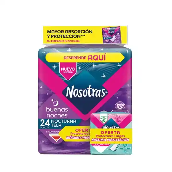 Contiene 2 Unidades. Toalla Higiénica Buenas Noches Tela 24 Und + Protector Diario 10 Und.