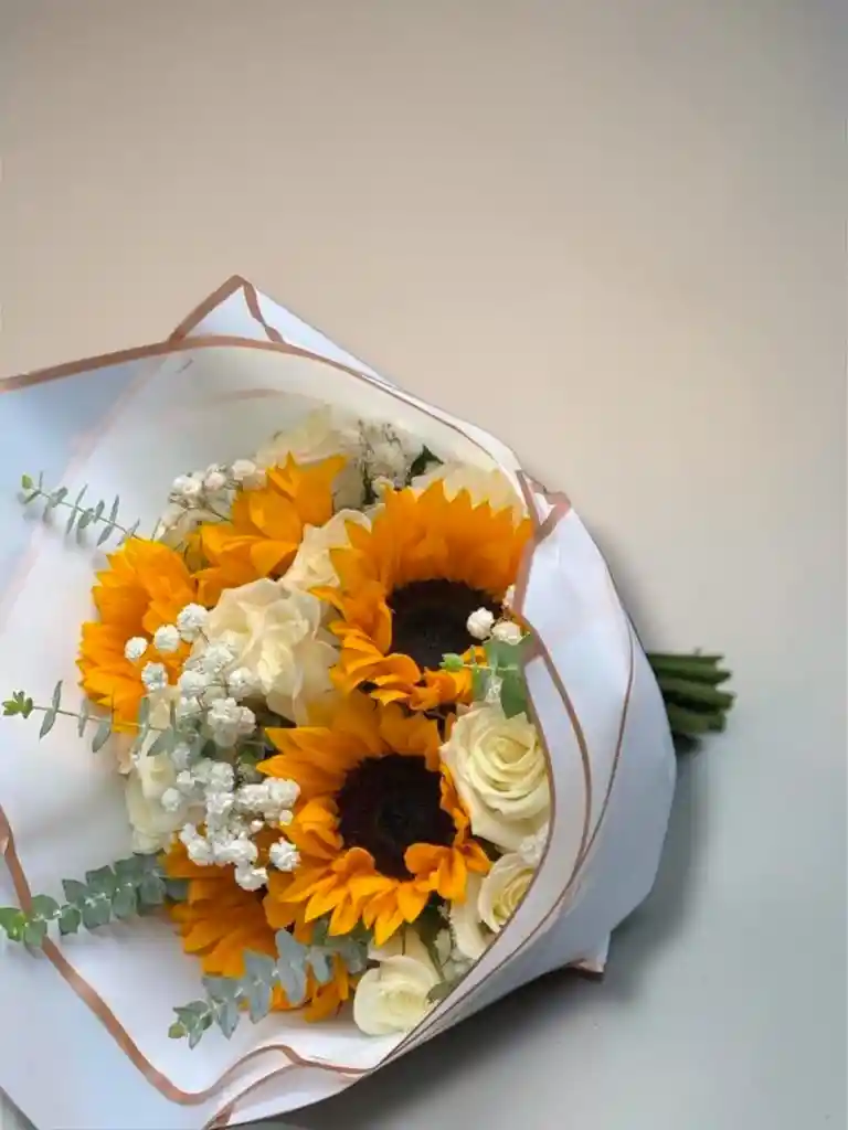 5 GIRASOLES Y 12 ROSAS BLANCAS CON EUCALIPTO Y GIPSOFILIA, ENVUELTO EN PAPEL COREANO ( COLOR DE PAPEL SEGUN DISPONIBILIDAD) Y MOÑO