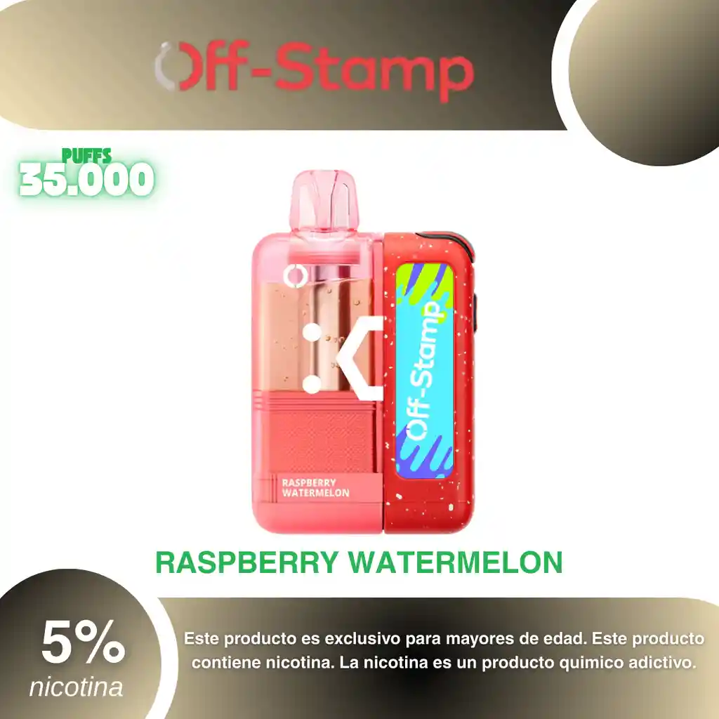 Off-Stamp Crystal Kit 35.000 Puffs Sabor Frambuesa Sandia 5% PROHIBIDA LA VENTA A MENORES DE EDAD. ADVERTENCIA: ESTE PRODUCTO CONTIENE NICOTINA, LA NICOTINA ES UNA SUSTANCIA QUIMICA ADICTIVA Y NOCIVA PARA LA SALUD. Los líquidos para vapeo contienen: propilenglicol USP, glicerina USP, sabor artificial y nicotina. Este producto puede contener nicotina, una sustancia altamente adictiva que puede generar dependencia, posibles afectaciones arteriales, cardiacas, pulmonares y otras aun no identificadas. No se recomienda su uso a mujeres en embarazo, puede generar lesiones al feto. Mantener alejado de niños y mascotas. No ingerir, puede generar irritación y/o intoxicación. Por favor antes de consumir consulte a su médico posibles afectaciones o sensibilidad a alguno de sus componentes. Los componentes de este producto pueden aumentar la sensación de ansiedad En caso de notar alguna reacción adversa por favor suspenda su uso de manera inmediata. Siga las instrucciones en el envase. No alterar sus componentes. Adquiera sus productos en sitios de confianza No use productos piratas, alterados, o en los cuales no pueda comprobar su buena procedencia, Verifique la reputación del fabricante y distribuidor antes de adquirir cualquier producto Si no es usuario fumador o vapeador no se recomienda su uso bajo ninguna circunstancia Al usar este producto usted es consciente que este producto puede generar afectaciones a su salud, incluyendo aquellas que a la fecha de la compra no se han identificado y que pueden aparecer a largo plazo
