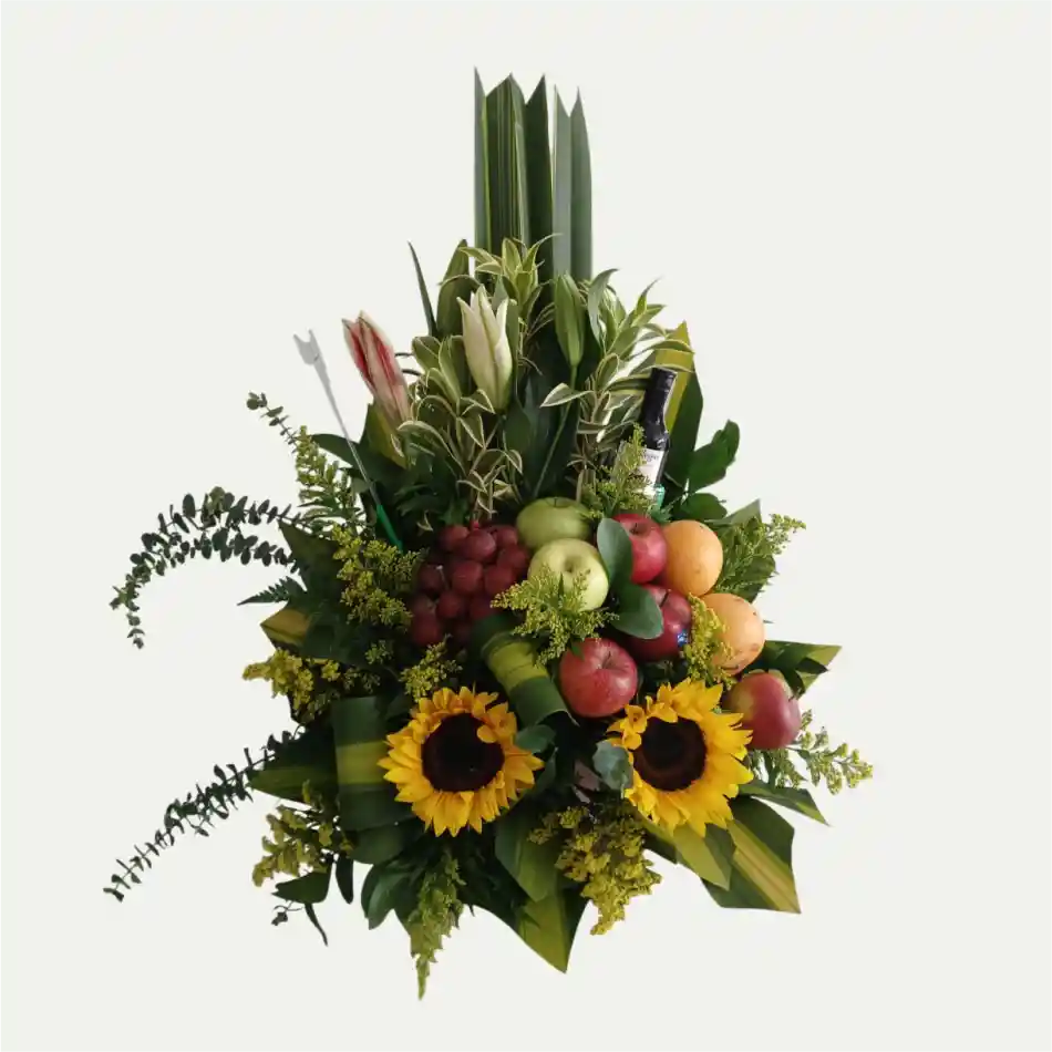 DESCRIPCIÓN: 2 girasoles, 1 vara de lirios, solidago, hojas de lino, hojas de drácena, canción de la India, vino Gato Negro pequeño, dos granadillas, 4 manzanas rojas, uvas chilenas, 2 manzanas verdes, variedad de follaje y canasta de mimbre. El amor suele surgir después de una mirada sutil, pero con el tiempo esa mirada se convierte en complicidad, en el refugio donde florece nuestra propia eternidad.