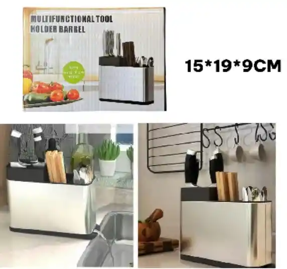 Este es un Organizador de Cubiertos de Cocina Multifuncional. Está diseñado para mantener los cubiertos y otros utensilios de cocina organizados y accesibles. Cuenta con múltiples compartimentos para separar cuchillos, tenedores, cucharas y otros utensilios.