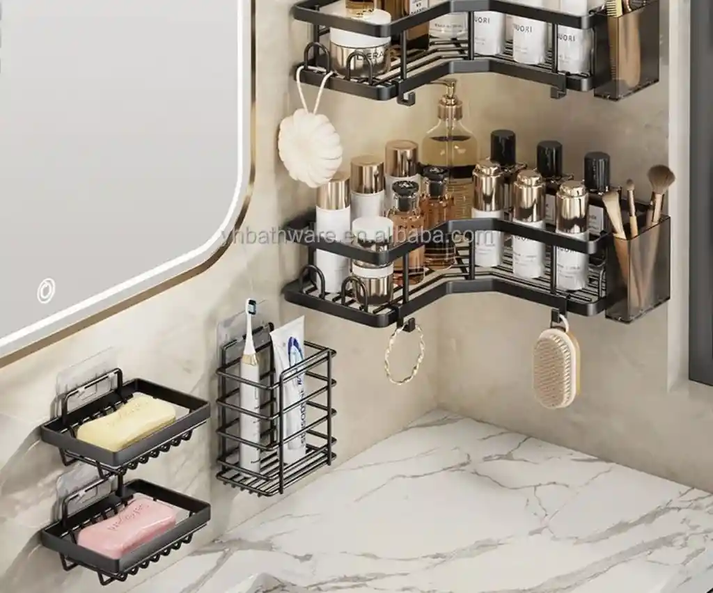 Este organizador de pared es la solución ideal para mantener tu baño ordenado, funcional y con un toque sofisticado. Cuenta con repisas esquineras de gran capacidad, perfectas para botellas, perfumes, cremas y dispensadores, optimizando cada rincón sin ocupar espacio extra. Incluye canastillas adicionales para jabones, esponjas y accesorios pequeños, además de soportes laterales ideales para cepillos, tubos de crema o productos de uso diario. Su diseño abierto permite un drenaje rápido, evitando acumulación de agua y humedad. Fabricado en material resistente y duradero, con acabado negro mate que combina fácilmente con cualquier estilo de baño. Se instala en pared (ideal para baños pequeños), manteniendo todo al alcance y perfectamente organizado.