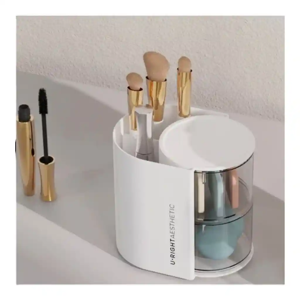 *¡¡BIENVENIDO A TONATEK!!* 1. CARACTERISTICAS DE LA COMPRA: 1.1 Esta compra incluye: - 1 Organizador De Brochas De Maquillaje Y Espojas 1.2 Características del producto: Organizador giratorio para maquillaje con diseño moderno y elegante, ideal para mantener brochas, esponjas y cosméticos siempre ordenados. Cuenta con compartimentos transparentes y sistema giratorio que facilita el acceso a cada producto. Incluye espacio superior para brochas y secciones internas para polvos, esponjas y accesorios. Su tamaño compacto permite colocarlo fácilmente en tocadores o mesas de maquillaje.