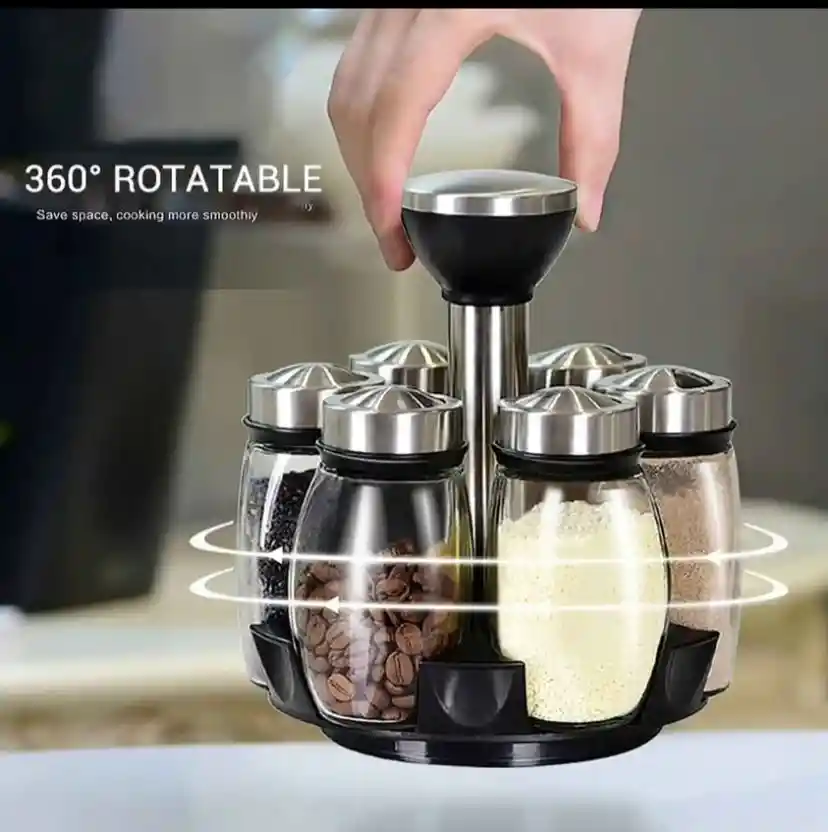 6 tarros de especias de vidrio: almacena hasta 6 especias diferentes, como sal, pimienta, cilantro, etc. Identificar fácilmente las especias del vidrio transparente. La tapa de cada frasco de vidrio está hecha de plástico. Gran capacidad y soporte de diseño giratorio para satisfacer la mayoría de las necesidades de cocina. Tamaño compacto para ahorrar más espacio en el mostrador/armario. El diseño giratorio facilita la extracción de especias. Se adapta perfectamente a diferentes tipos de especias, sin problemas de obstrucción. Elegante y clásico, perfectamente adaptado a varios ambientes de cocina.