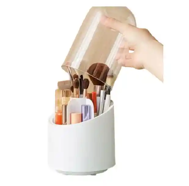 Diseño Giratorio: Cuenta con una base que permite una rotación suave de 360°, facilitando el acceso a todos los pinceles desde cualquier ángulo. Tapa Transparente: Incluye una cubierta acrílica o de plástico transparente que protege las brochas del polvo y la suciedad, a la vez que permite ver el contenido fácilmente. Material de Calidad: Está fabricado con plástico (a menudo ABS) de alta calidad, que es duradero y resistente para el uso diario. Compartimentos: El interior tiene múltiples compartimentos o ranuras (comúnmente tres) de diferentes alturas para clasificar eficientemente brochas de distintos tamaños y otras herramientas cosméticas. Multiusos: Además de brochas de maquillaje, puede usarse para organizar lápices labiales, delineadores, o incluso artículos de baño como cepillos de dientes y pasta dental. Fácil Limpieza: El diseño simple y los materiales de plástico facilitan la limpieza del organizador. Estabilidad: La base cuenta con un diseño antideslizante para asegurar que permanezca estable en el tocador o lavabo.