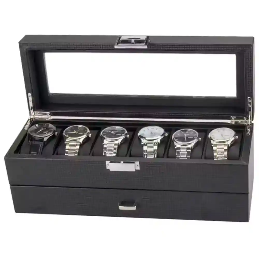 Los organizadores de relojes es perfecto para mantener tus relojes, joyas y accesorios en orden y protegidos. Esta caja para guardar relojes tiene un elegante diseño en cuero sintético negro de alta calidad, cuenta con 2 niveles. En el primer nivel es para guardar relojes y el segundo nivel para otros accesorios. Es el regalo perfecto para un hombre y completar así un closet de lujo. Especificaciones: Largo 34cm, ancho 12cm, altura total 13cm. Color negro, interior en cuero sintético. Capacidad para 6 relojes. El precio corresponde solo al Organizador de Relojes, los demás productos hacen parte de la ilustración del uso.