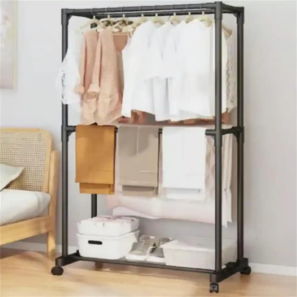 Material: Está hecho de metal de alta calidad con un proceso de pintura antioxidante. Diseño: Es un perchero de doble barra, que proporciona el doble de almacenamiento. Cuenta con dos niveles para colgar ropa y un estante inferior para zapatos u otros artículos. Movilidad: Incluye 4 ruedas resistentes, de las cuales 2 tienen freno y bloqueo, lo que facilita su movimiento y seguridad. Dimensiones aproximadas: Las dimensiones son de 110 cm de ancho, 150 cm de alto y 41 cm de profundidad. Capacidad de peso: El peso máximo soportado es de 32 kg.
