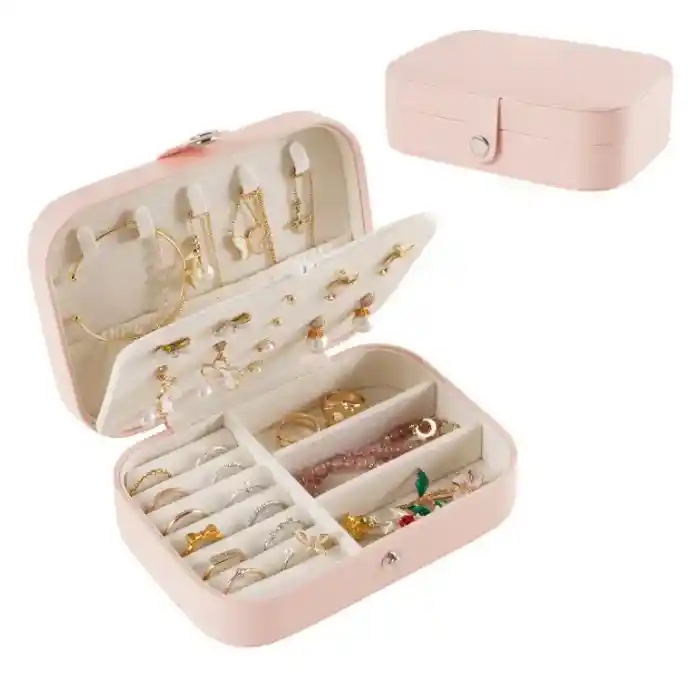 "Hermoso joyero con un diseño simple y compacto de aspecto elegante para organizar y almacenar aretes, collares, anillos, etc. Su tamaño es ideal para transportar todos tus accesorios de manera segura evitando enredos y daños. La tapa y la base son sólidas, bien construidas y resistentes, mantienen todas sus joyas queridas bien organizadas con este estuche. Un gran regalo para tu madre, novia, esposa, hija, compañeros de clase, colega, amigos, etc. también el mejor regalo de los días de San Valentín, regalo de cumpleaños, regalo del Día de la madre, regalo de Navidad para ella. Material: cuero sintético - franela Medidas aproximadas: 16cm*5cm*11cm