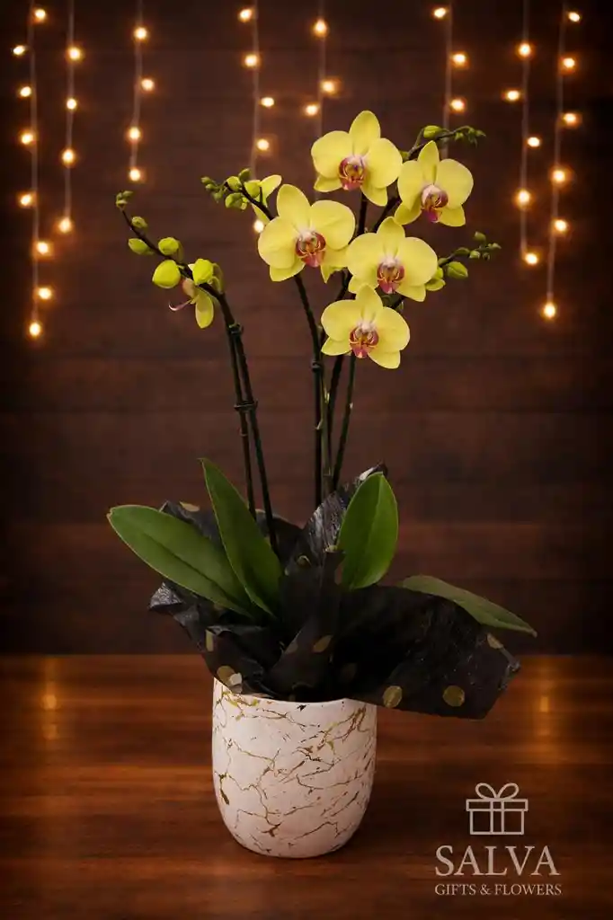 Exclusiva Orquídea Phalaenopsis amarilla, presentada en matera de lujo cuidadosamente seleccionada para resaltar su elegancia y presencia. Un regalo sofisticado que simboliza alegría, prosperidad y buena energía, ideal para cumpleaños, agradecimientos, celebraciones especiales o para dar un toque distinguido a cualquier espacio. Cada orquídea es una pieza natural y única. La cantidad de flores abiertas, botones y la tonalidad del color pueden variar, garantizando un producto vivo, fresco y de alta calidad. 🎁 Regalo de lujo listo para entregar 🌼 Planta natural premium en matera decorativa 🏡 Ideal para hogar u oficina ✨ Detalle elegante, duradero y exclusivo