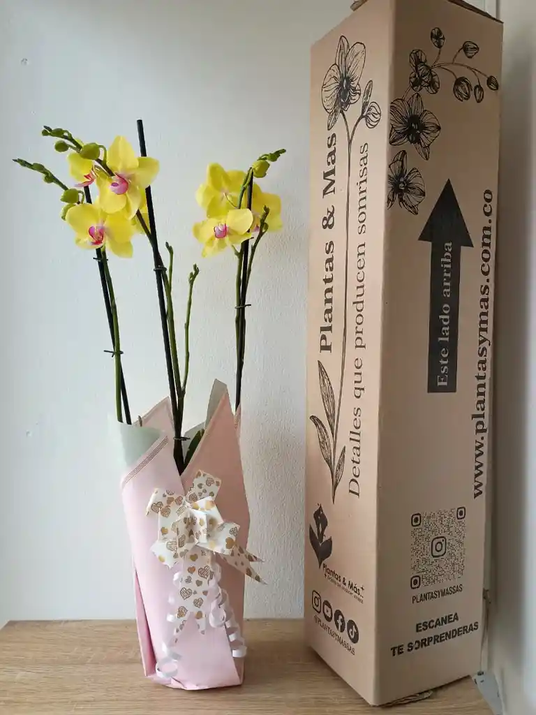 Haz una declaración de alegría y elegancia con esta impresionante orquídea Phalaenopsis amarilla de tres varas. Su tono vibrante, combinado con un centro fucsia profundo, la convierte en un regalo impactante y en una pieza decorativa de gran presencia. Floración: 3 – 6 meses Aprox. Tamaño: 35 – 60 cm Alto aprox. Incluye: Matera transparente, orquídea tono amarillo 3 tallos, viene con mas de 8 botones próximos abrir,opción de tarjeta personalizada. Politica de envió: Envíos únicamente en Bogotá.