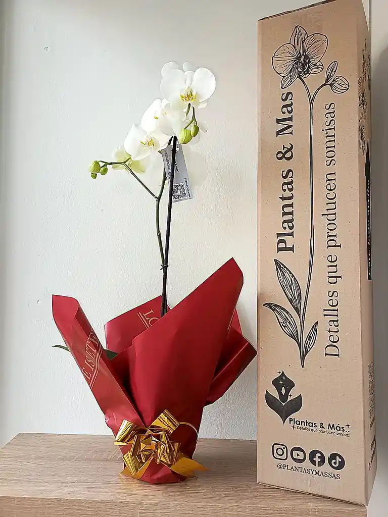 Regala una flor que habla por sí sola. Esta orquídea blanca de dos varas es la expresión perfecta de elegancia, paz y admiración. Sus pétalos blancos como la nieve y su centro fucsia intenso crean un contraste sutil pero poderoso, ideal para decorar o sorprender a alguien especial. Floración: 3 – 6 meses Aprox. Tamaño: 35 – 60 cm Alto aprox. Incluye: Matera transparente, orquídea blanca 1 tallo, viene con 6 botones próximos abrir,opción de tarjeta personalizada. Politica de envió: Envíos únicamente en Bogotá.