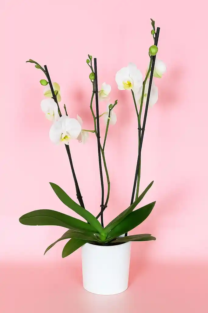 orquidea elite blanca de 3 varas con matera blanca altura promedio 55 cm.