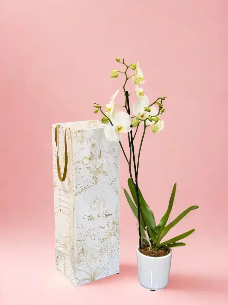 Orquidea grande blanca de 1 vara con matera de cerámica blanca, acompañada de un empaque de lujo y tarjeta