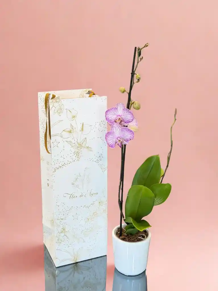Orquidea grande de 1 varas rosada con matera blanca. El color de la orquidea puede tener variaciones por cosechas.
