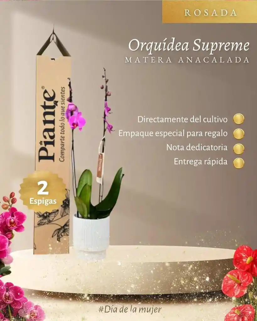 Dale un toque especial a cualquier espacio con nuestra Orquídea Supreme, una planta elegante, delicada y perfecta para decorar salas, oficinas, escritorios o sorprender con un regalo lleno de vida. 💐 Flores exóticas y sofisticadas. 🌿 Tamaño ideal para cualquier ambiente. ✨ Seleccionadas cuidadosamente para garantizar frescura y excelente presentación. El color puede variar según el estado de floración, haciendo que cada planta sea única. Podrás recibir tonalidades blancas, rosadas, fucsias, amarillas o combinaciones naturales, según disponibilidad y proceso natural de la flor. 📸 La fotografía es imagen de referencia. El color puede variar según disponibilidad y etapa de floración. 🌺 Un detalle hermoso, natural y lleno de elegancia.