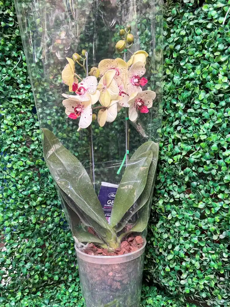 En nuestro vivero te presentamos esta hermosa orquídea de tonos crema con delicados puntos rosados, una variedad única que destaca por su diseño natural y su floración elegante.Hecha para quienes buscan elegancia con un carácter único