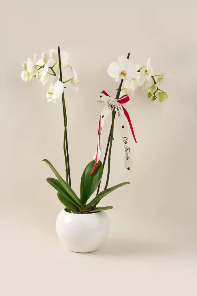Nuestra orquídea en presentación en matera de cerámica blanca, esta orquídea transmite pureza, distinción y un amor que perdura en el tiempo.