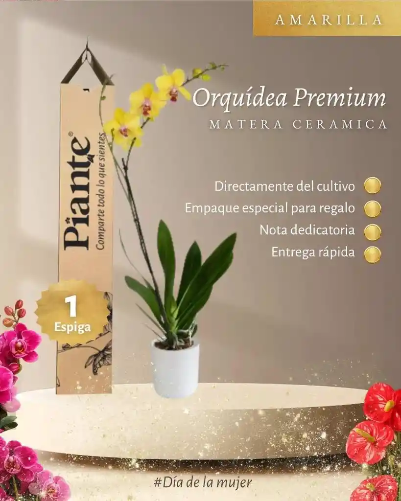 Dale un toque especial a cualquier espacio con nuestra Orquídea Premium, una planta elegante, delicada y perfecta para decorar salas, oficinas, escritorios o sorprender con un regalo lleno de vida. 💐 Flores exóticas y sofisticadas. 🌿 Tamaño ideal para cualquier ambiente. ✨ Seleccionadas cuidadosamente para garantizar frescura y excelente presentación. El color puede variar según el estado de floración, haciendo que cada planta sea única. Podrás recibir tonalidades blancas, rosadas, fucsias, amarillas o combinaciones naturales, según disponibilidad y proceso natural de la flor. 📸 La fotografía es imagen de referencia. El color puede variar según disponibilidad y etapa de floración. 🌺 Un detalle hermoso, natural y lleno de elegancia.