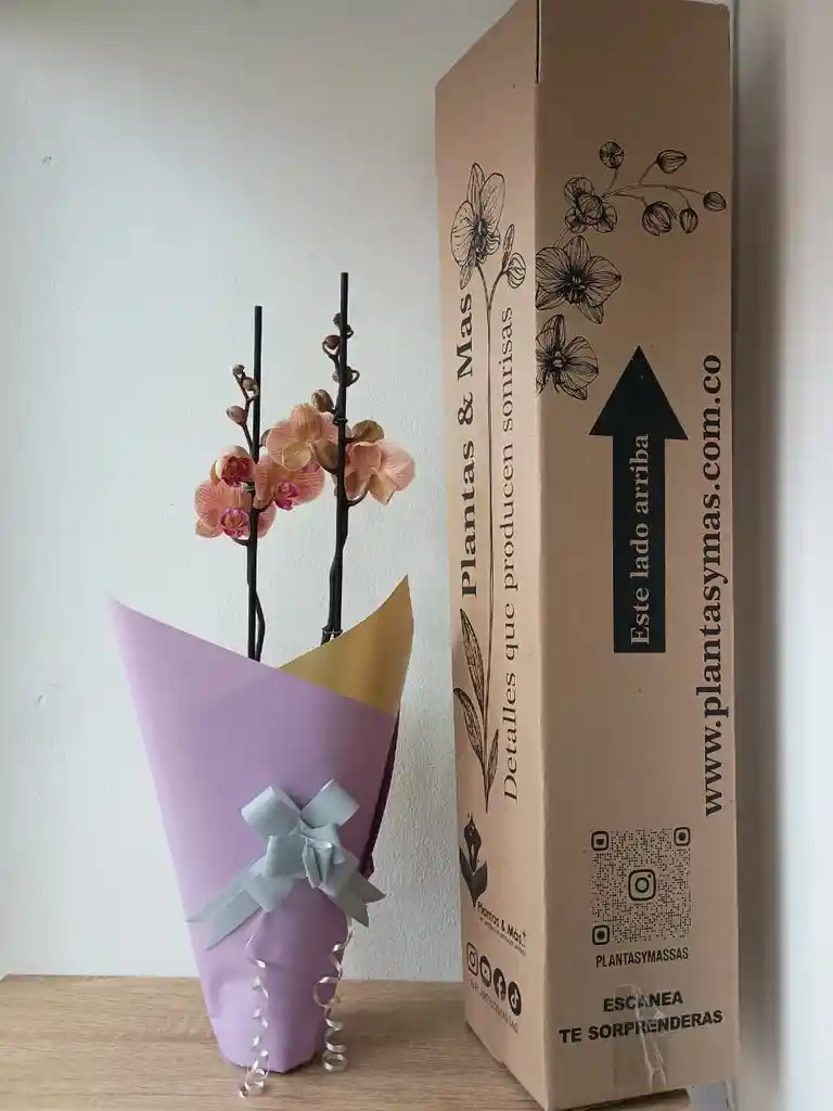 Sutil, romántica y encantadora. Esta orquídea en tono salmón claro con centro rosado es perfecta para transmitir cariño, ternura y buen gusto. Sus pétalos tienen un suave diseño de líneas que le dan textura visual, ideal para quienes aman los detalles delicados y sofisticados. Floración: 3 – 6 meses Aprox. Tamaño: 35 – 60 cm Alto aprox. Incluye: Matera transparente, orquídea tono salmon 2 tallos, viene con 4 botones próximos abrir,opción de tarjeta personalizada. Politica de envió: Envíos únicamente en Bogotá.