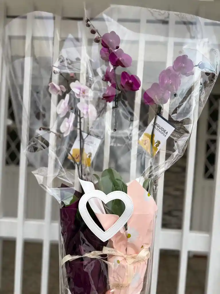 IMAGEN GUIA: Hermoso combo compuesto por una orquídea de 1 vara y una orquídea de 2 varas en bolsa de lujo perfecto para regalar y alegrar el dia