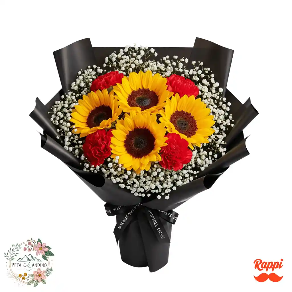 5 girasoles 3 claveles rojos 5 ramitas de gipsófila blanca