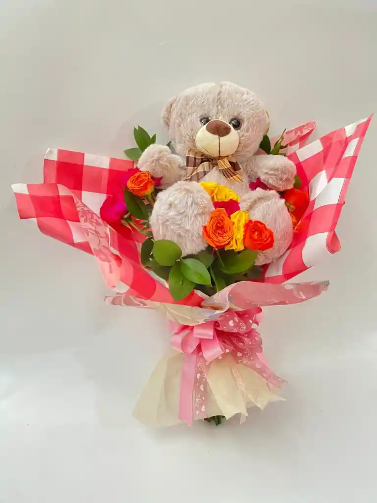 Oso de peluche acompañado de mini rosas de colores y decorado con papeles de colores, formando un bouquet. Nota: Producto por preparar. Por favor realizar el pedido con tres horas de anticipación