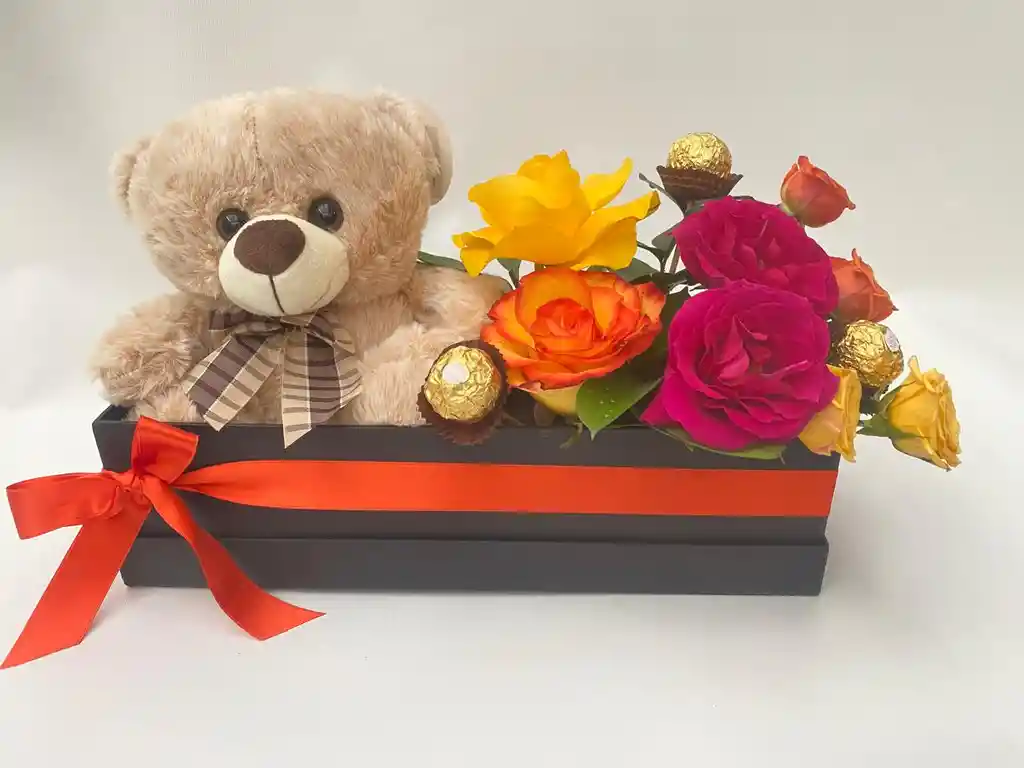 Caja rectangular con un osito de peluche, rosas y chocolates. Nota: Producto por preparar. Por favor realizar el pedido con tres horas de anticipación