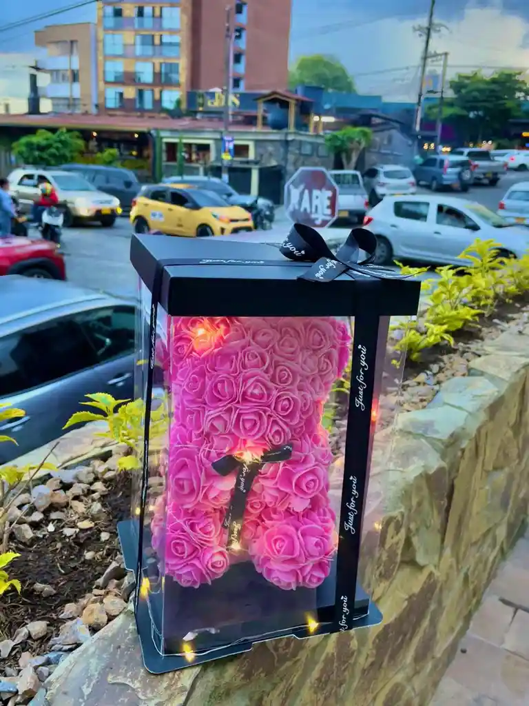 Un detalle único que enamora 💖. Oso elaborado con rosas eternas en tonos rosado o rojo, presentado en caja premium transparente con moño de tela y delicadas luces LED que realzan su encanto. Ideal para sorprender con ternura y elegancia en cualquier ocasión. 📌 Pregunta por la disponibilidad de colores.