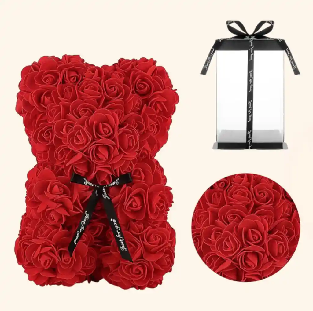 Osito de 29 cm hecho con rosas artificiales, presentado en caja de acetato con moño. Un regalo delicado y lleno de amor
