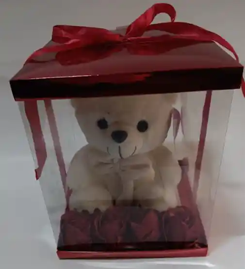 cajita oso moño coquete contiene caja de acetato 20*20*25 oso moño coquete 22 cm 4 rosas en cinta