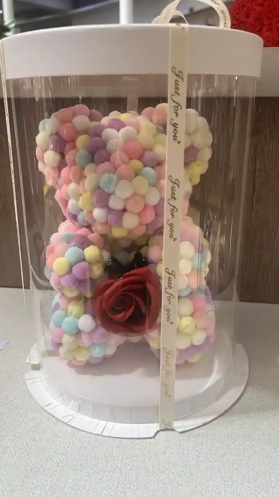 Oso de Pompones Multicolor: un diseño vibrante y alegre, confeccionado con suaves pompones en tonos pastel (rosa, amarillo,azul,lila). Cuenta con un detalle central de una rosa roja y un pequeño lazo negro. Se presenta en un estuche cilíndrico transparente con base blanca y un lazo decorativo con la frase "Just for you". Hechos a mano, cada oso es ensamblado con cuidado para un acabado perfecto. Materiales duraderos: pompones suaves y rosas de espuma que conservan su forma y su color. Presentación premium: El empaque transparente resalta la belleza del produnto y lo convierte en un regalo listo para entregar. Regalo ideal: perfecto para cumpleaños, aniversarios, san valentín o cualquier ocasión especial.