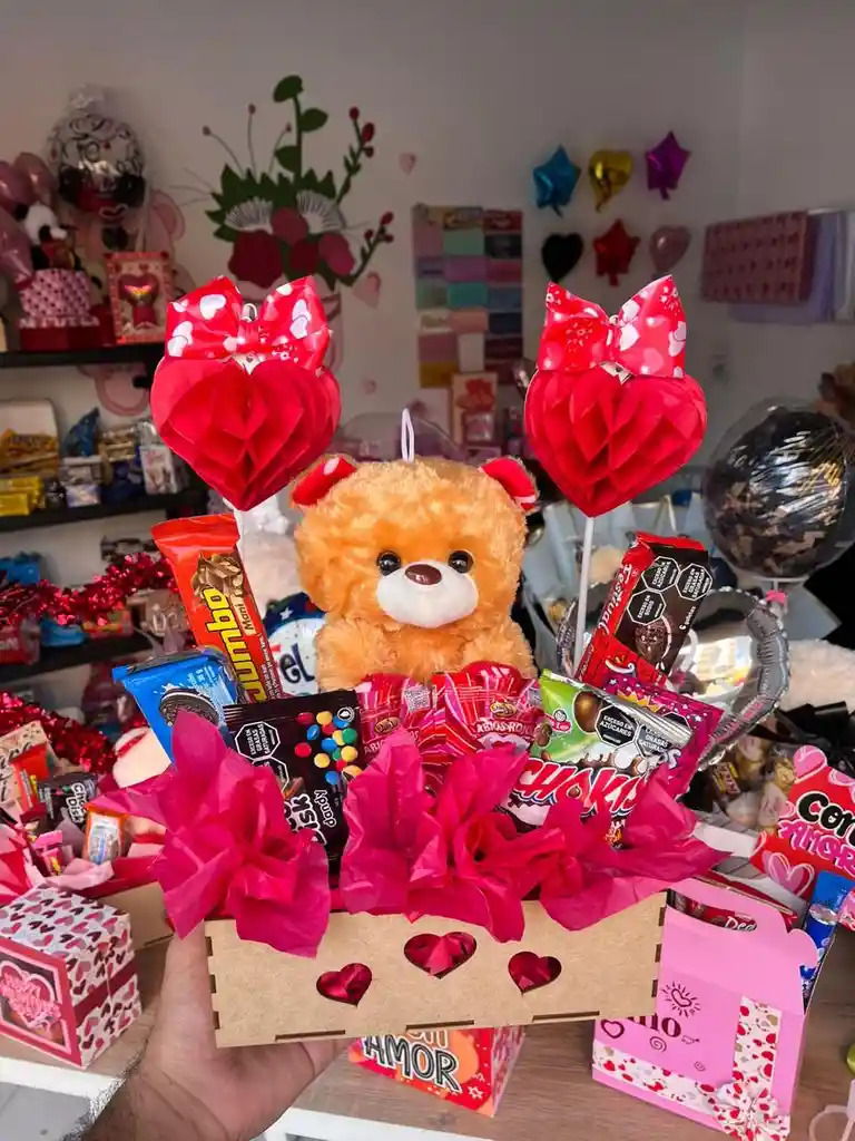 Incluye: caja de madera, girasol x1, rosas rojas x4, rosas amarillas x2, oso de peluche (varía según disponibilidad), follaje, mensaje personalizado.