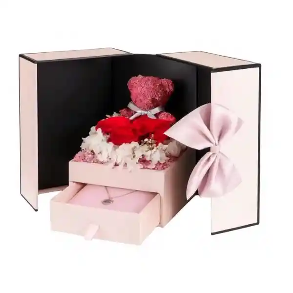 Oso Rosas Flor Eterna Boda Con Collar Caja Rosada