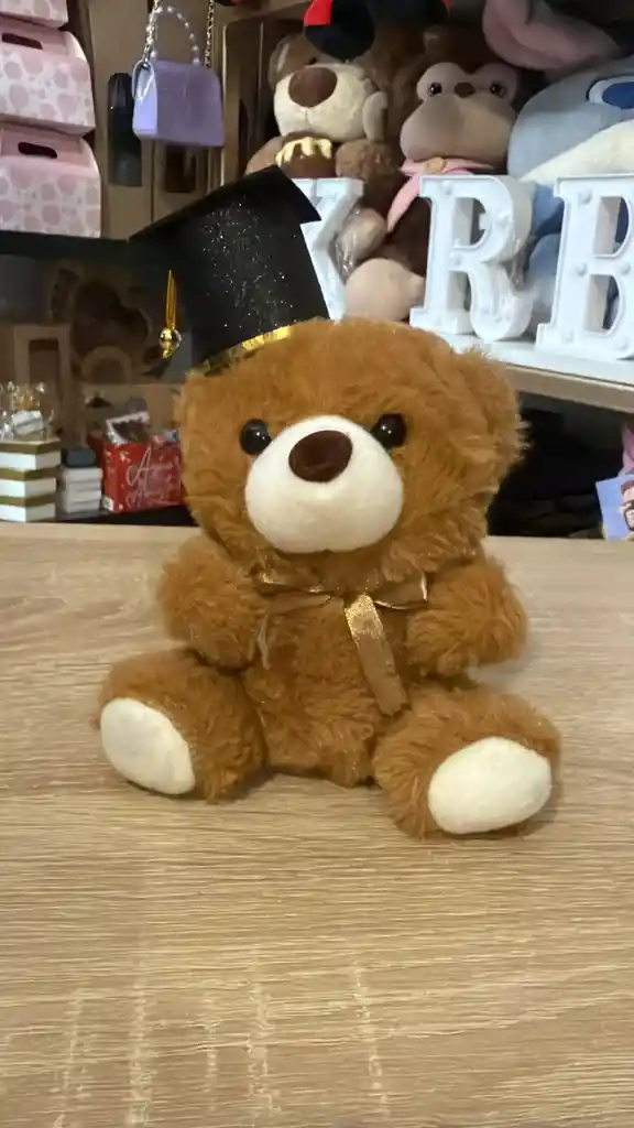 Oso de peluche pequeño en color café claro con textura rizada. Viste un birrete (gorro de graduación) negro con purpurina, borde dorado y borla amarilla. Incluye un lazo satinado dorado al cuello. Hocico y plantas de los pies en color crema contrastante. Felpa suave de poliéster, detalles en cartón/tela brillante para el birrete y relleno de algodón sintético.