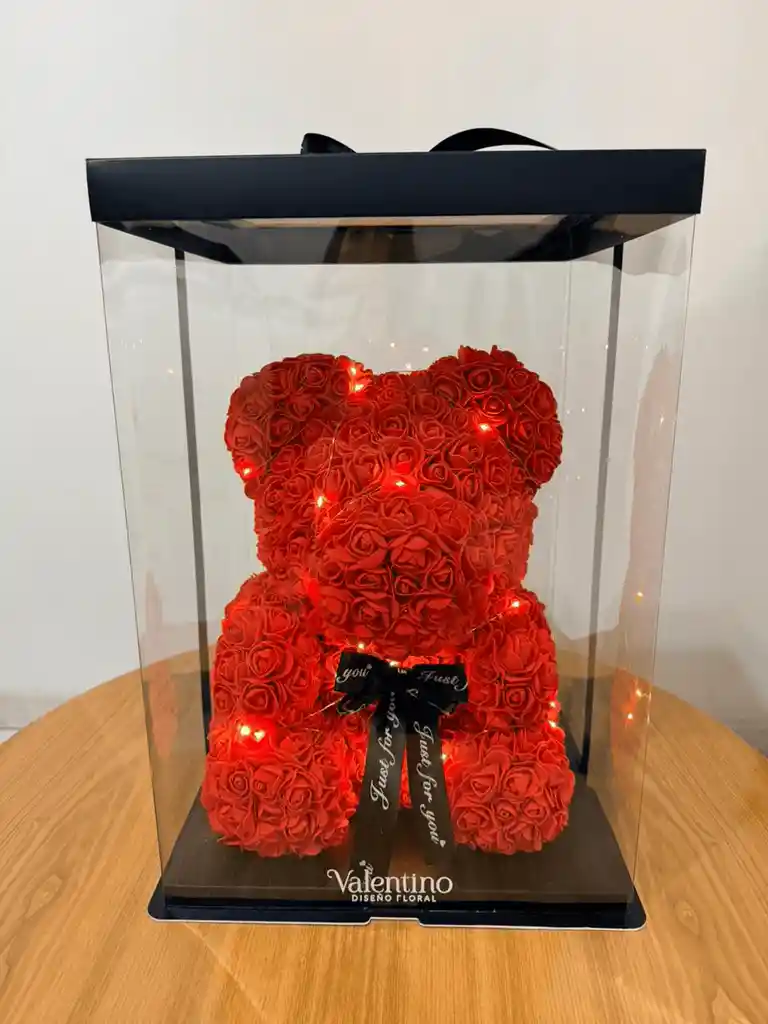 Sorprende con un regalo inolvidable. Hermoso oso elaborado artesanalmente con delicadas rosas artificiales premium en color rojo, detalles en blanco y luces LED cálidas integradas que crean un efecto mágico y romántico. Presentado en una elegante caja en acetato transparente con base negra, perfecto para conservarlo y exhibirlo como pieza decorativa. 🎁 Ideal para: aniversarios, cumpleaños, San Valentín, fechas especiales o simplemente para decir “te amo”. ✨ Duración: larga duración, no requiere mantenimiento. 📦 Incluye: caja acetato y presentación de lujo.