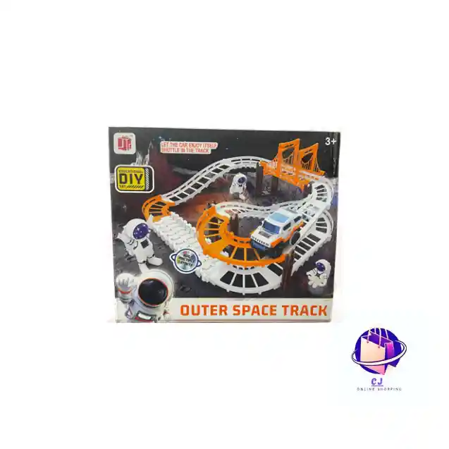 Pista Outer Space Track con diseño inspirado en el espacio. Incluye piezas coloridas para armar un circuito divertido y emocionante. Fabricada en material resistente y liviano, ideal para que los niños disfruten carreras con temática espacial.