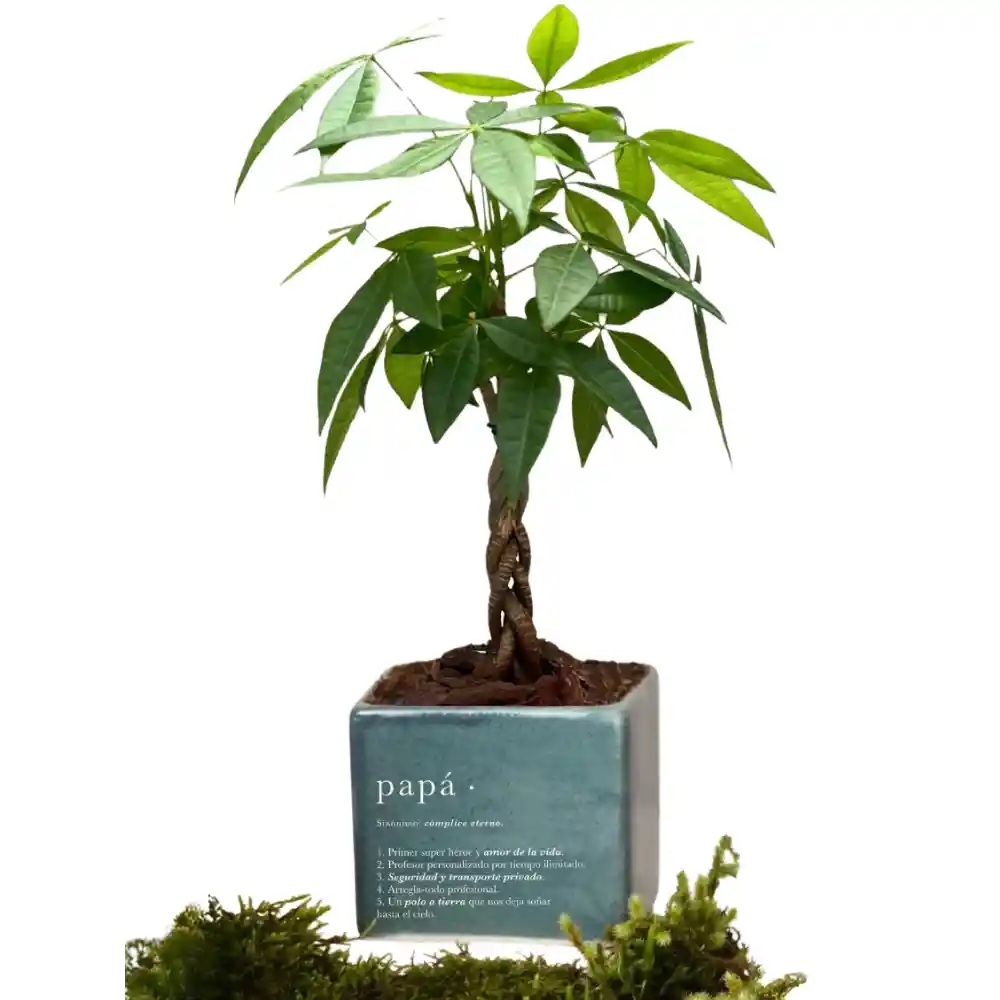 Pachira Baby, planta del dinero y la abundancia, en matera en cerámica con definición de Papá. ¡Todo empacado en una cajita de cartón hermosa y listo para regalar! Todas las plantas vienen con un código QR que podrás escanear para conocer sus cuidados y aprender tips y trucos para que permanezcan hermosas. Matera en cerámica hecha a mano estampada con la definición de Papá. Medidas: 8 cm largo x 8 cm ancho x 7 cm alto. Color Matera: Verde, hecha a mano. Color Estampado: Blanco. Pachira baby, planta del dinero y la abundancia. Medidas: 25 cm de alto aproximadamente ¡Todo empacado en una cajita de cartón hermosa, lista para regalar! Importante: El color, el tamaño y la forma de la planta pueden variar. El hecho de estar vivas hace que cada uno sea único y especial.