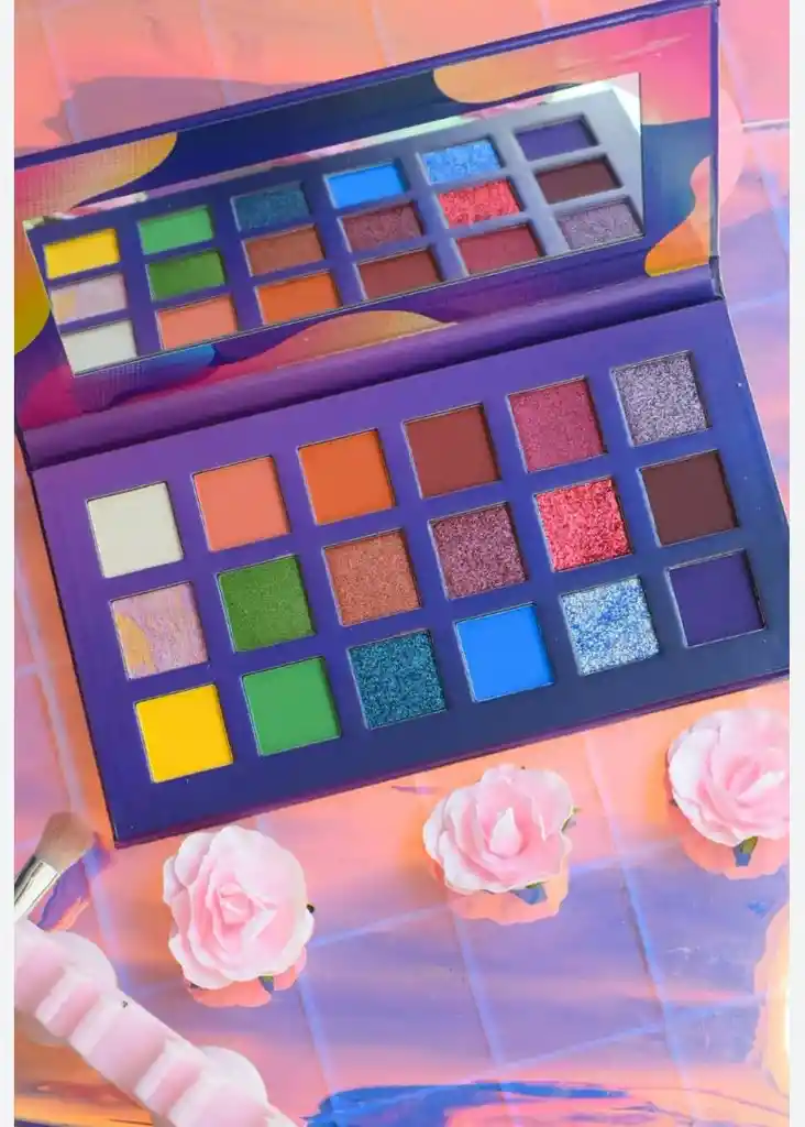 producto de la imagen es una paleta de sombras de ojos de 18 colores de la marca Paulis. La paleta contiene 18 tonos de sombras, incluyendo acabados mate, satinados y con brillo. Se caracteriza por tener una excelente pigmentación y una textura suave. Es un producto de calidad profesional diseñado para crear looks variados. La paleta incluye un espejo y es ideal para llevar en la cosmetiquera.