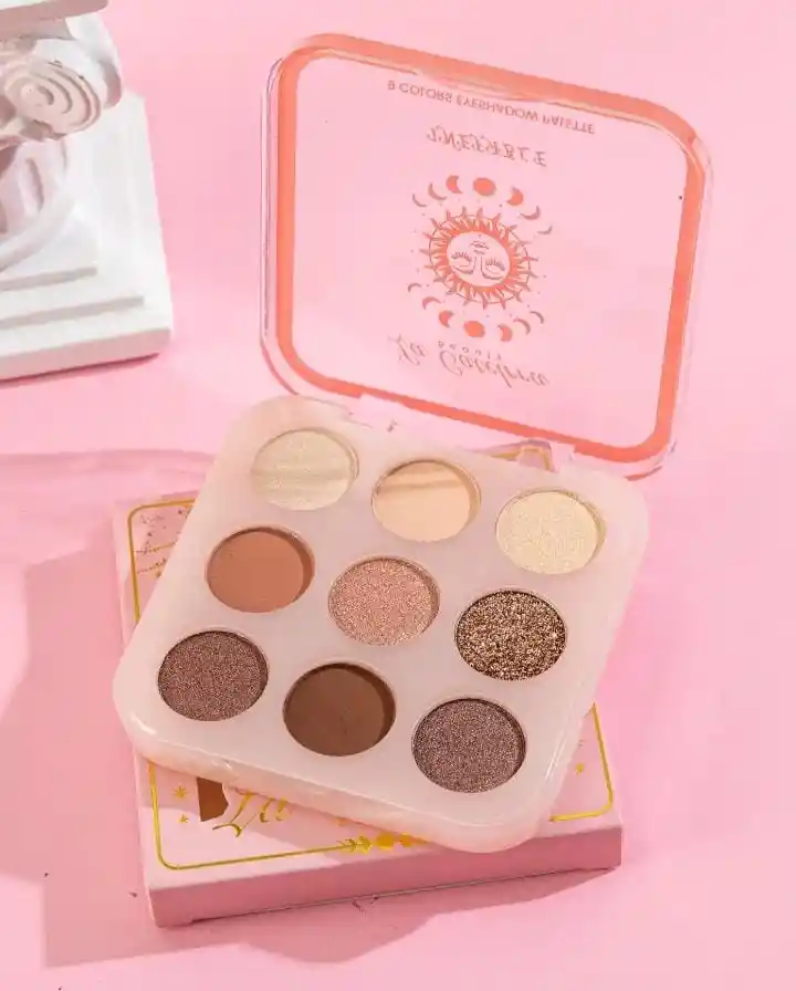 Esta es una paleta de sombras de ojos Calterra (posiblemente la Sombra Sol y Luna x 9 Tonos). Contiene 9 tonos, incluyendo acabados satinados y mate. La paleta se centra en tonos neutros, cafés y nude. Incluye un tono brillante con purpurina.