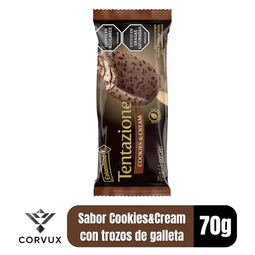 Paleta de Crema sabor Cookies&Cream con trozos de galleta, salsa de chocolate y cobertura sabor Chocolate con chips de galleta oscura.
