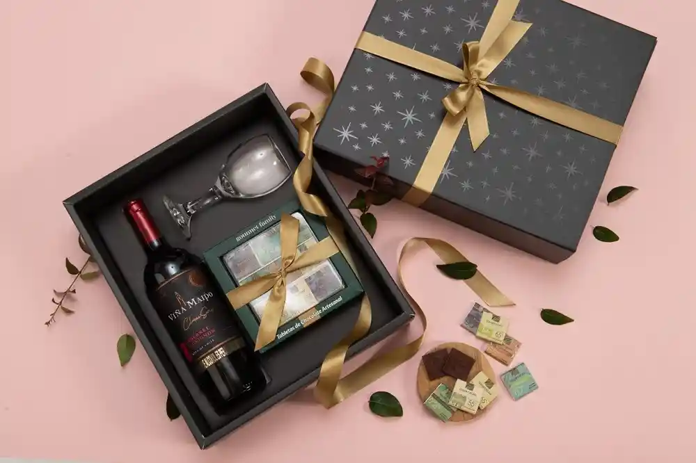 Botella de vino (750 ml) acompañada de mix de chocolates artesanales de diferentes regiones de Colombia y copa...Ver más