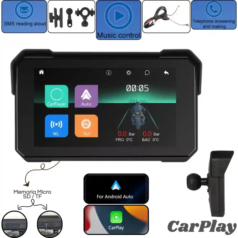 Pantalla CarPlay Para Motocicleta Dispositivo de Navegación Portátil Moto ¡Moderniza tu motocicleta y lleva tu experiencia de conducción al siguiente nivel! Con esta Pantalla Inteligente, ya no necesitas exponer la cámara de tu celular a las vibraciones ni tu dispositivo a la lluvia. Conecta tu teléfono de forma inalámbrica y ten acceso a todas tus aplicaciones favoritas directamente en tu manillar. Características: - Conectividad Inalámbrica: Compatible con Apple CarPlay y Android Auto. Sincroniza tu smartphone vía Bluetooth/WiFi automáticamente al encender la moto. Olvídate de los cables. - Resistencia Extrema: Totalmente impermeable y resistente al polvo. Diseñada para soportar condiciones extremas. - Pantalla Táctil Optimizada: Panel de alta definición (HD) con tecnología IPS que ofrece visibilidad clara incluso bajo la luz directa del sol. - Navegación en Tiempo Real: Visualiza Waze, Google Maps o Apple Maps en una pantalla dedicada, facilitando la lectura de rutas sin distracciones ni riesgos. - Instalación Universal y Fácil: Compatible con el 99% de las motocicletas (desde scooters hasta de alto cilindraje). Incluye soporte de brazo ajustable para manubrios tubulares y opción para retrovisor. Especificaciones: - Tamaño de Pantalla: 5 pulgadas (Aprox.). - Brillo: Alto contraste para visión diurna y modo nocturno automático. - Conexiones: Bluetooth 5.0, WiFi. - Funciones de Voz: Compatible con Siri y Google Assistant. Paquete Incluye: - Pantalla Inteligente para Moto. - Soporte de montaje para manubrio. - Soporte de montaje para retrovisor. - Cableado de alimentación. - Manual de instrucciones.